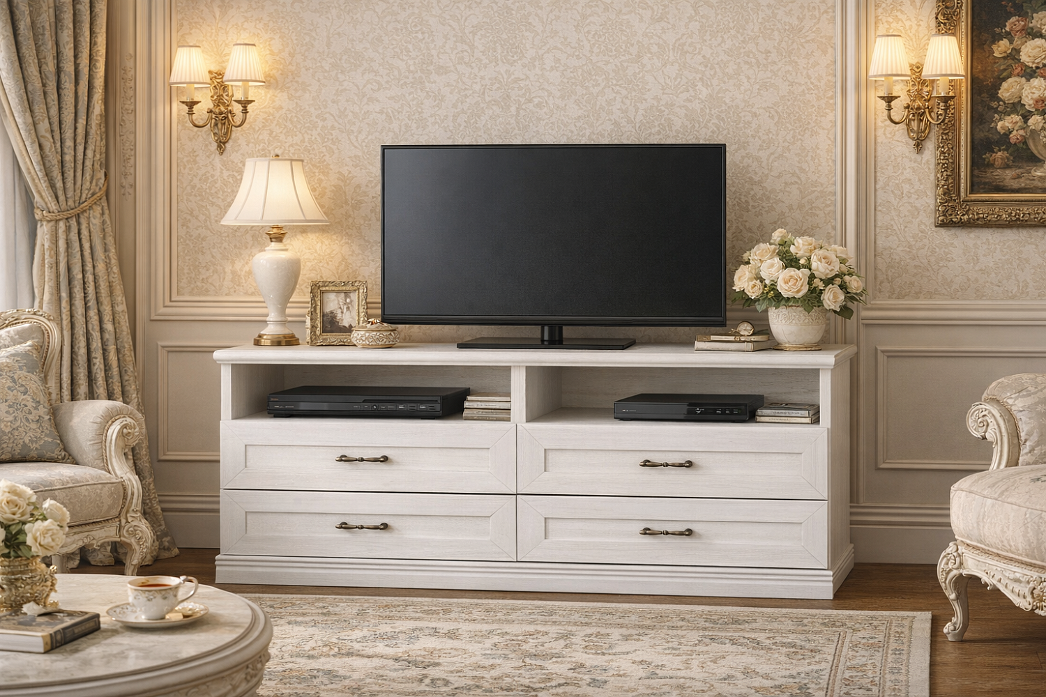 Искали тумбу под телевизор в гостиную — жена хотела что-то в деревенском стиле, но не слишком вычурное. В итоге взяли кантри в светлом оттенке (почти белый, но с рисунком под дерево). Выглядит симпатично, но не без косяков.