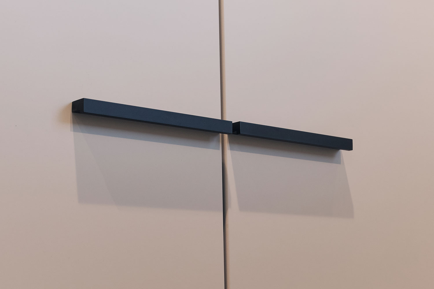 Все модули гармонично сочетаются друг с другом. Черный акцентный мрамор добавляет коллекции изысканности и роскоши, а выразительная геометрия тонких черных ручек на фасадах, перетекающая в линию опор, придают ей современный вид.