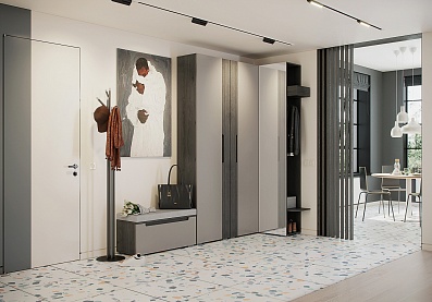 В набор входят два навесных шкафчика, две небольшие настенные полки, напольный шкаф и компактная ТВ-тумба с четырьмя выдвижными ящиками разного размера. Матовые светлые поверхности разбавлены полупрозрачными вставками, обрамленными более темным профилем. Эстетичное стекло StopSol с пиролитическим отражающим покрытием скрывает содержимое отсеков при дневном свете и подчеркивает его при включении внутренней LED-подсветки. Скрытая фурнитура делает мебель более воздушной и легкой.